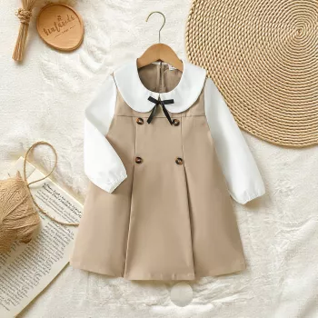 Girls Preppy Winter Dress with Doll Collar and Bow for Ages 4-7