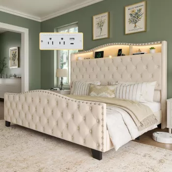 Luxurious King Size Platform Bed Frame with Upholstered Headboard