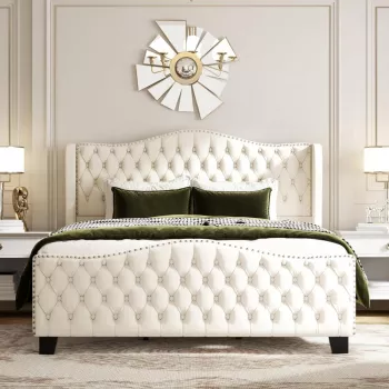 Solid Wood King Size Bed Frame with Upholstered Tufted Headboard