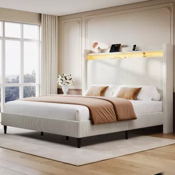 Queen Size LED Bed Frame with Headboard, Storage & Charging Station