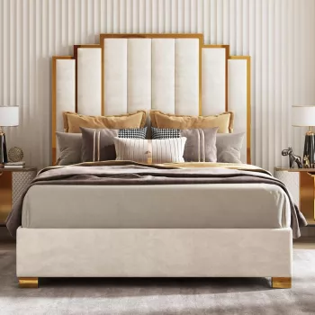 Queen Size Cream Velvet Upholstered Bed with Tall Gold Headboard