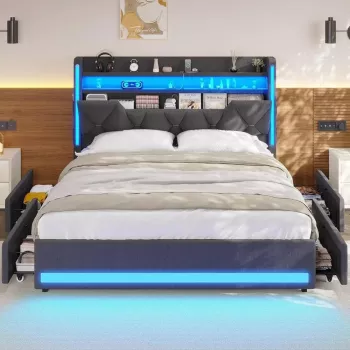Modern Upholstered Bed Frame with LED Lights, Storage Drawers & Charging Station
