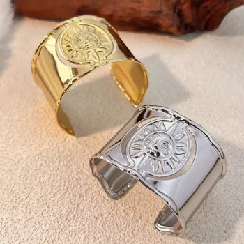 Gold Plated Stainless Steel Wide Sun Pattern Cuff Bracelet for Women