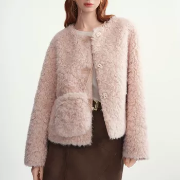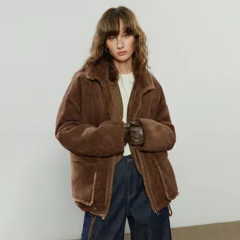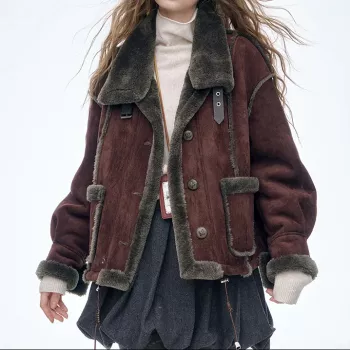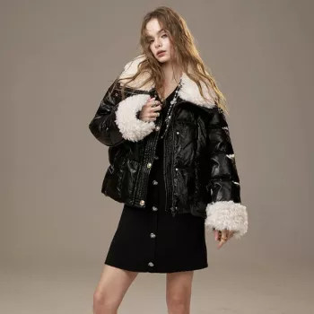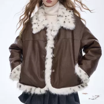 Faux Leather Plush Lapel Winter Jacket for Women