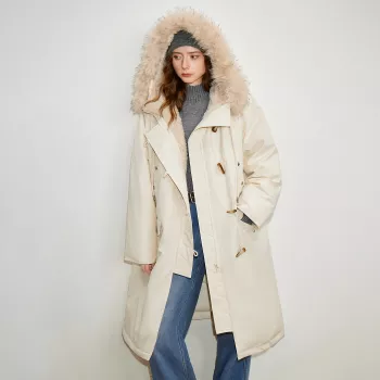 Asymmetrical Mid-Length Hooded Down Jacket with Faux Fleece