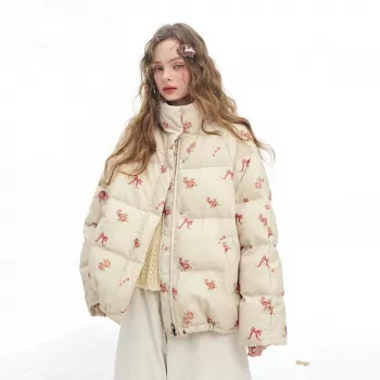 Vintage Rose Bow Puffer Jacket with Stand Collar for Women