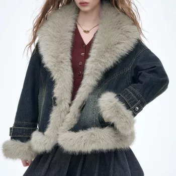 Y2K Vintage Plush Lapel Faux Leather Winter Coat for Women