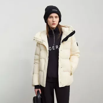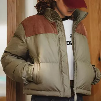 Women’s Cropped Down Puffer Jacket with Suede Patchwork & Stand Collar