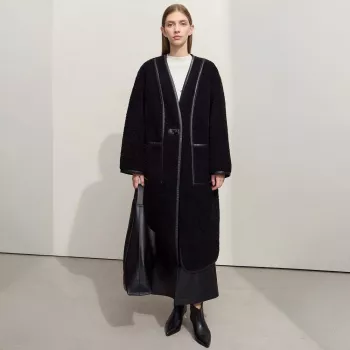 Women’s Long Wool Fur Coat with V-Neck and Leather Buckle