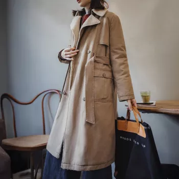 Women’s Double-Breasted Belted Trench Coat with Warm Sherpa Lining
