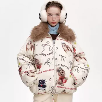 Stand Collar Cartoon Print Short Down Jacket for Women