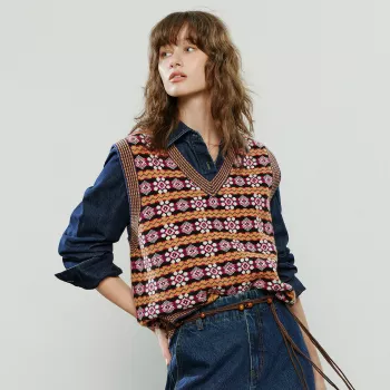 Women’s Retro Knitted Floral V-Neck Sleeveless Vest for Winter Layering