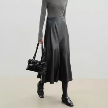 High-Waist Pleated Mid-Calf Faux Leather Winter Skirt