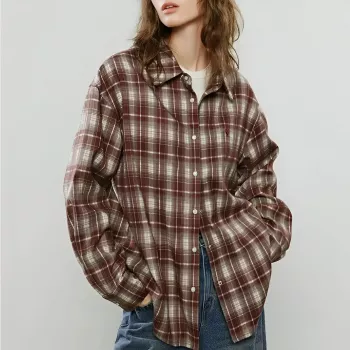 Women's Retro Plaid Burgundy Flannel Blouse - Cozy Loose Fit Casual Shirt