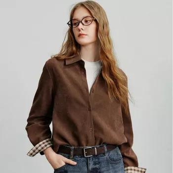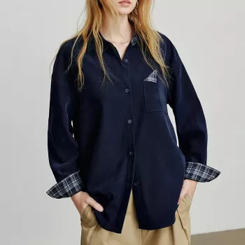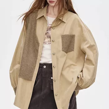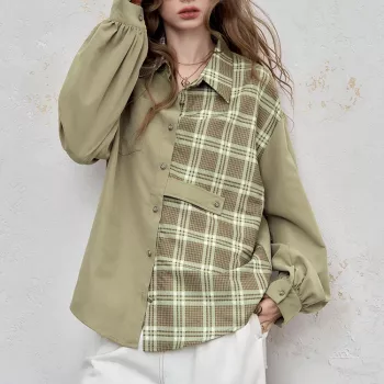 Casual Oversize Woven Color Block Patchwork Button Shirt for Women