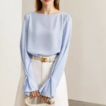 Elegant Solid Slash Neck Chiffon Blouse with Flare Sleeves for Women
