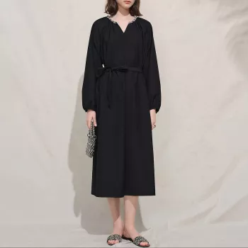 Women's Black Denim Patchwork A-Line Midi Dress with Three Quarter Sleeves