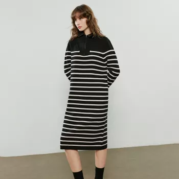 Winter Striped Knitted Zipper Lapel Loose Slimming Dress for Women