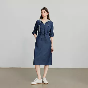 Women's Color Blocking Hooded Denim Workwear Mid-Length Dress
