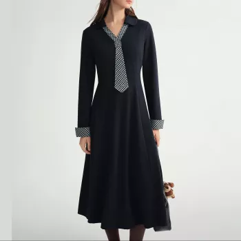 Women's Winter Plaid Tie-Neck Shift Dress with Asymmetric Panel Design