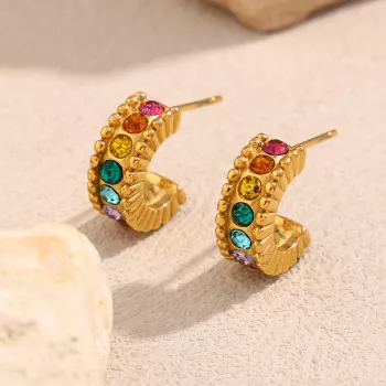 Colorful Zirconia C-Shaped Gold-Plated Stainless Steel Stud Earrings