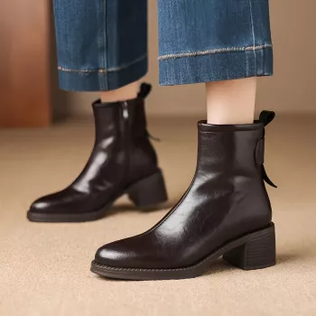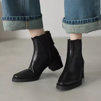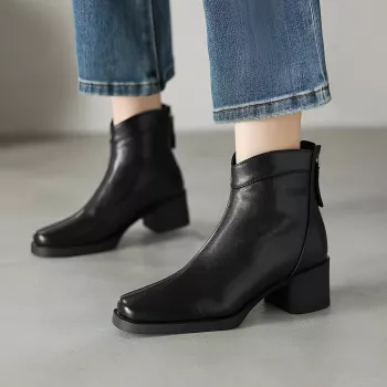 Women’s Square-Toe Leather Ankle Boots with Chunky Heel