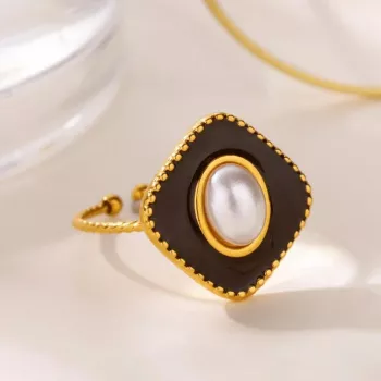 Gold Plated Vintage Pearl & Enamel Geometric Ring for Women