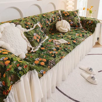 Pastoral Cotton & Linen Sofa Blanket with Floral Skirt – Anti-Slip Sofa Cover
