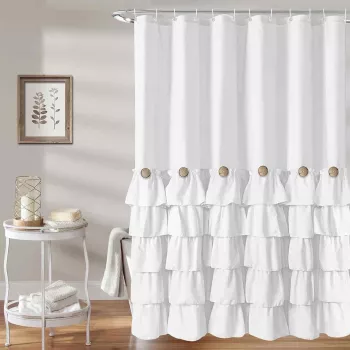 White Ruffle Farmhouse Shower Curtain with Decorative Button Detail