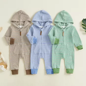 Hooded Striped Baby Romper with Zipper