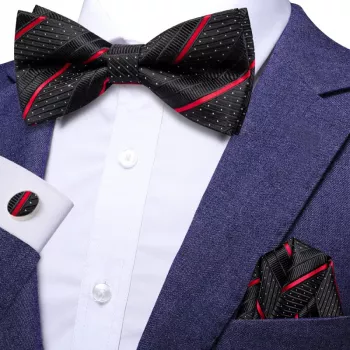 Black Red Striped Silk Bow Tie Set with Handkerchief & Cufflinks