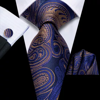 Elegant Paisley Navy Blue and Gold Silk Tie Set with Cufflinks