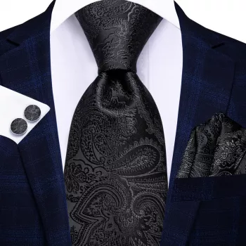 Black Paisley Silk Necktie with Hanky & Cufflinks Set
