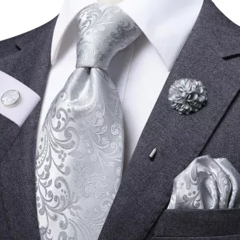 Men’s Silver Floral Silk Tie Set with Pocket Square & Cufflinks