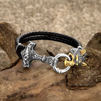 Retro Viking Leather Bracelet with Thor's Hammer & Odin’s Wolf