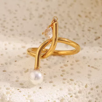 Minimalist Knotted Tassel Zircon Pearl Open Ring in Gold-Tone Steel