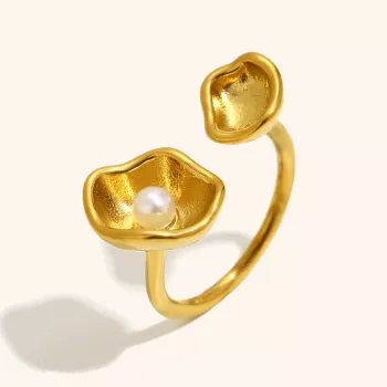 Clam Shell Pearl Open Ring in 18K Gold Plated Stainless Steel