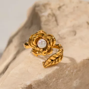 Opal Gemstone and Pearl Vintage Lotus Flower Ring in Stainless Steel