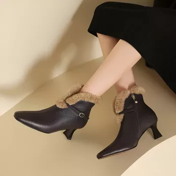 Winter Sheepskin Ankle Boots for Women with Pointed Toe & Kitten Heel