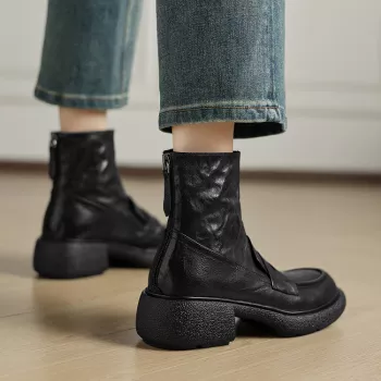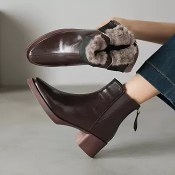Winter Women's Chunky Heel Leather Boots with Zipper