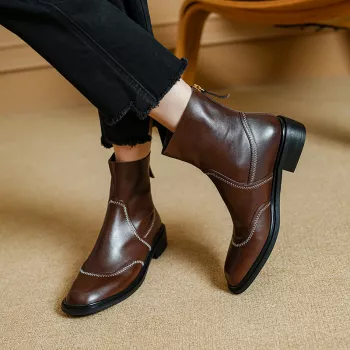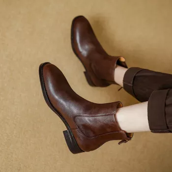 Women’s Retro Leather Ankle Boots with Thick Square Heel