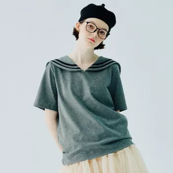 Summer Cotton Loose Fit Sailor Collar T-Shirt for Women