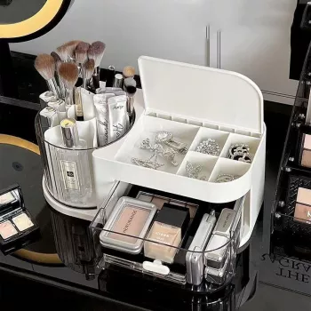 3-in-1 Rotating Makeup Organizer with Jewelry Box and Brush Holder