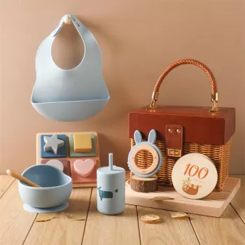 6-Piece Silicone Baby Feeding Set with Wooden Teethers & Milestone Cards