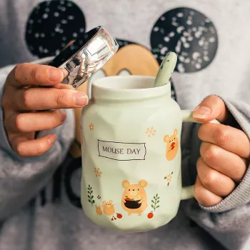 Cute Cartoon Ceramic Mug with Mirror Lid and Spoon