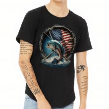 Use our battle tested marketing materials for Flag Behind Bass Fishing Curved Hem T-Shirt - Patriotic T-Shirt - Cool Curved Hem Tee