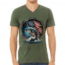 Flag Behind Bass Fishing V-Neck T-Shirt - Patriotic T-Shirt - Cool V-Neck Tee