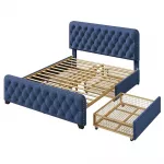 Our platform bed is crafted with attention to detail. It supports up to 800 lbs, with each drawer capable of holding 50 lbs. The frame is made of metal and linen, ensuring both durability and comfort. The bed accommodates an 8'' mattress perfectly and requires two people for assembly. Don't miss the chance to redefine your bedroom with our Elegant Upholstered Platform Bed. Order now and step into a world of comfort, style, and impeccable organization!