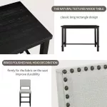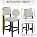 The ergonomic design of the chairs with 3.9-inch thick cushioning, curved backrests upholstered in a velvety linen-like fabric, and stylish brass-finished nail head trim offers an invitation to sit back and relax in utmost comfort. Whether you're enjoying a quiet breakfast or hosting a lively gathering, this dining set is best used as the centerpiece of your dining room, where comfort and elegance meet.