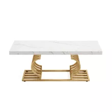 The table’s striking faux marble top, measuring 47.24” W x 19.68” D, provides ample space for your daily needs. Its 1.96-inch thick top, made of warp-resistant MDF and durable laminate, ensures longevity and ease of maintenance. The luxe geometric gold frame, with its double C-shape cutouts, offers both stability and a touch of modern artistry. Its solid, rust-proof metal frame can support up to 220 lbs, making it as sturdy as it is stylish.